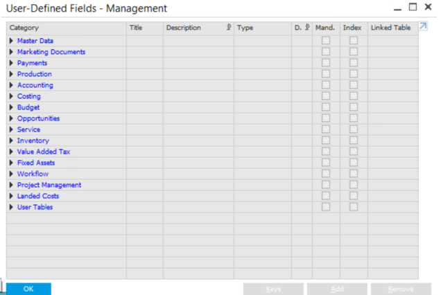 UDF (User-Defined Fields) is a powerful tool in SAP Business One. This function allows users to customize the system based on their needs. To set up a UDF, go to Bar menu and choose Tools > customize tool. Users can change or set up items in “User-Defined Tables – Setup” or “User-Defined Fields – Management”.