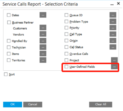 The UDF choice can also be found in Service Calls by Queue, Response Time by Assigned to, Average Closure Time, Service Contracts, and Equipment Card Reports.