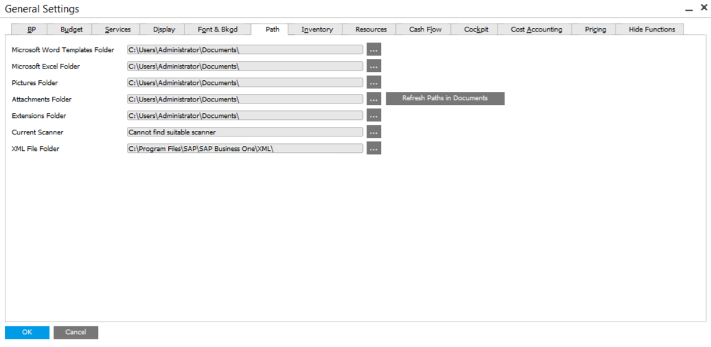 First of all, we need to decide a default attachments folder. Go to Administration > System Initialization > General Settings > Path tab and choose the path.
