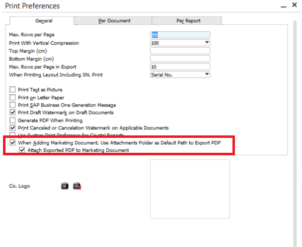 Then go to Administration > System Initialization > Print Preferences > General tab, choose “When Adding Marketing Document, Use Attachments Folder as Default Path to Export PDF” and then select the checkbox “Attach Exported PDF to Marketing Document”. Go to Per Document tab, choose the documents you want to transfer and select “Export to PDF” under “When Adding Document”.