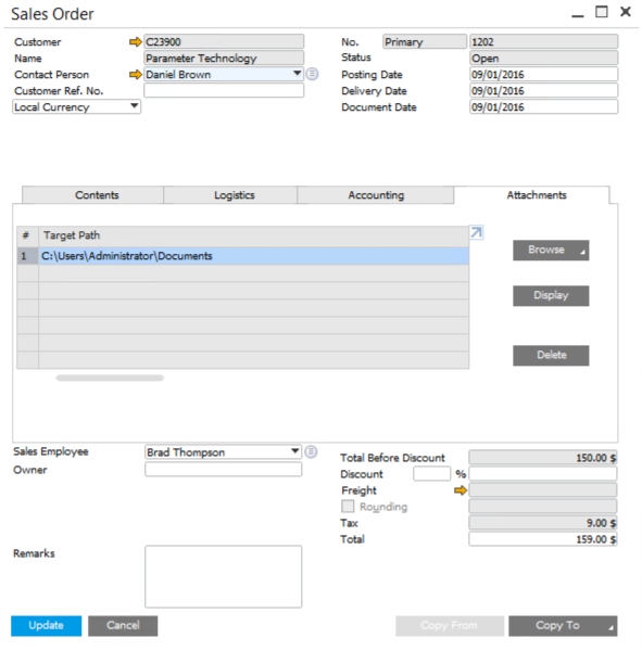 Here we go, we open and create a Sales Order, for example, and it automatically transfer and attached the document.