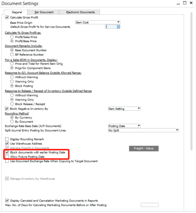 These two options are not selected in the default setting, which means users can add documents with earlier posting date but cannot create documents with future posting date.