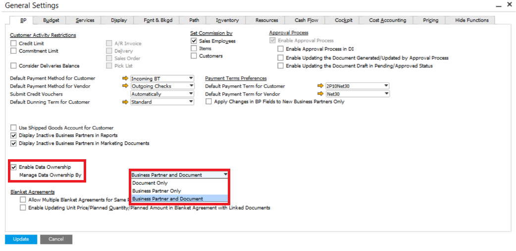 Enable Data Ownership allow manager to limit the access to BP and documents based on BP owners. You can decide to manage data ownership by document, BP, or both. The choice “Allow BP Without an Owner” allow you not to assign the owner, and every will see this BP.