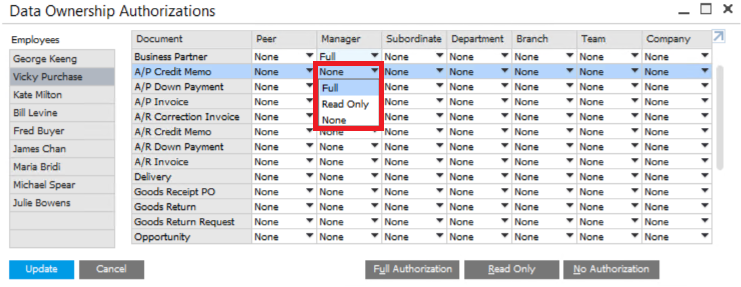 Also, go to Administration > System Initialization > Authorizations > Data Ownership > Data Ownership Authorizations. You can change the authorizations of each employee by documents.