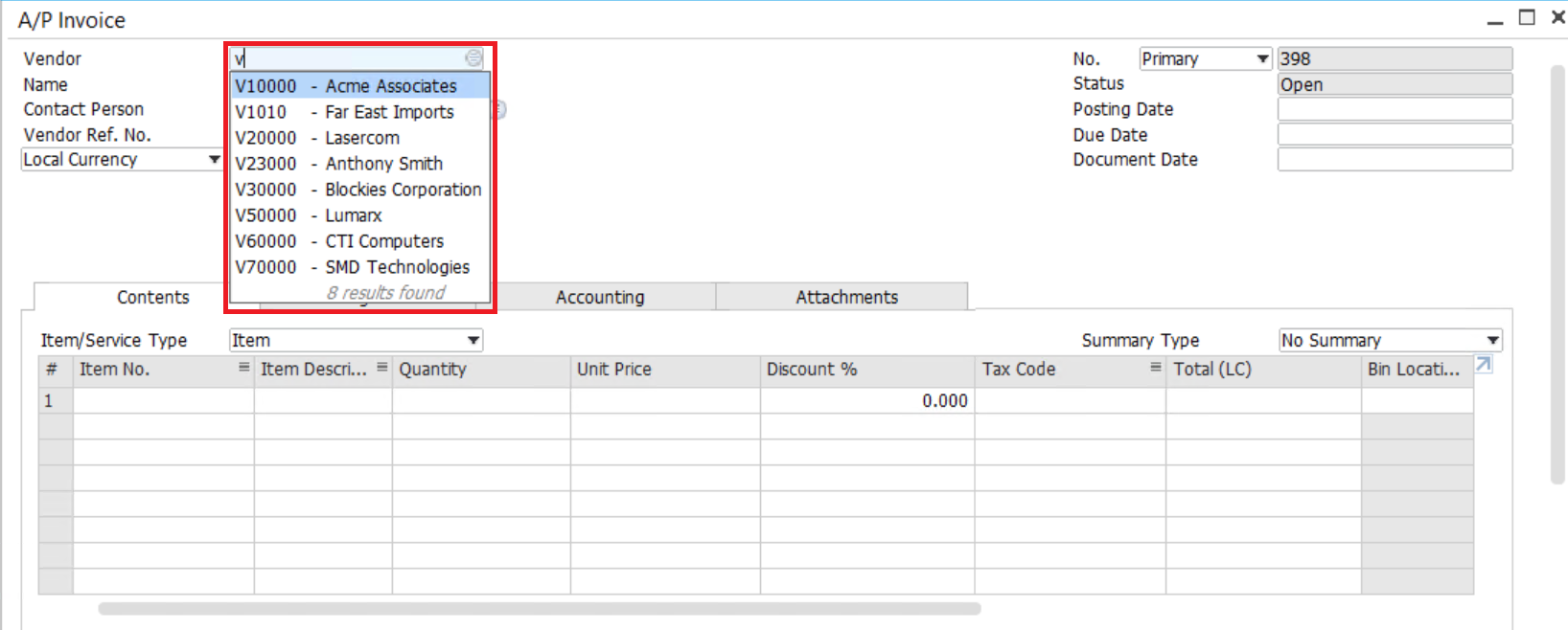 Actually, SAP Business One also has same functions. When you type in characters in the field, a list of choice will show up as below. As you type more words in it, the system will help you narrow down the list and find out the item you want.