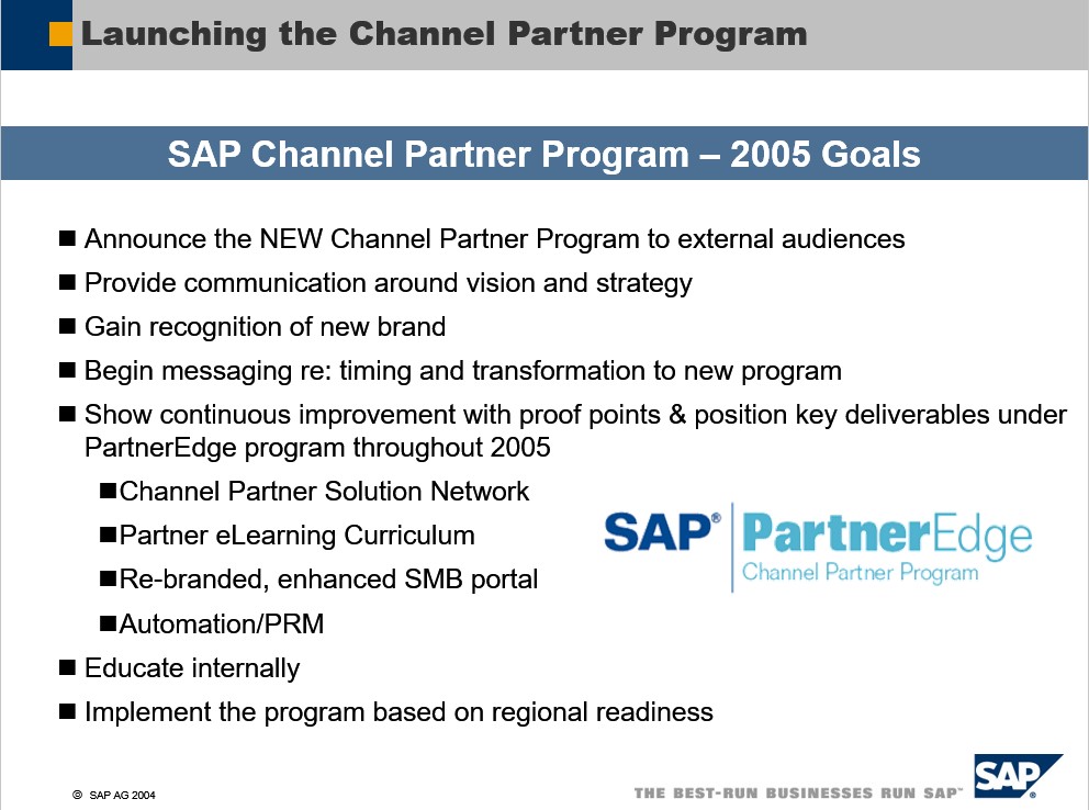 Back in 2004, SAP management was focused on giving SAP Business One and its other Small and Midsize Business solutions a huge market lift. They knew that the best and most practical route-to-market was the indirect partner channel. To have a shot at success, SAP needed a solid program framework that would advocate partners and set us up to dramatically expand the success of SAP. The program also needed to scale to support all applicable solutions, including build, sell and service solutions across all market segments and industries on a global basis.