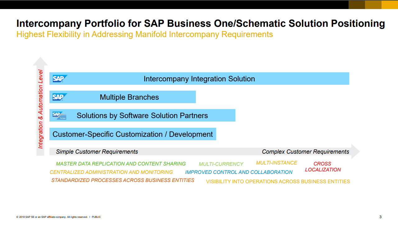 Operational visibility and risk management are key considerations for any business with multiple operational units. The Intercompany integration solution for SAP Business One helps a company meet these requirements by providing multilevel financial consolidation, consolidated trial balance, consolidated profit and loss statement, consolidated balance sheet, branch inventory in warehouse report, and branch balances report.