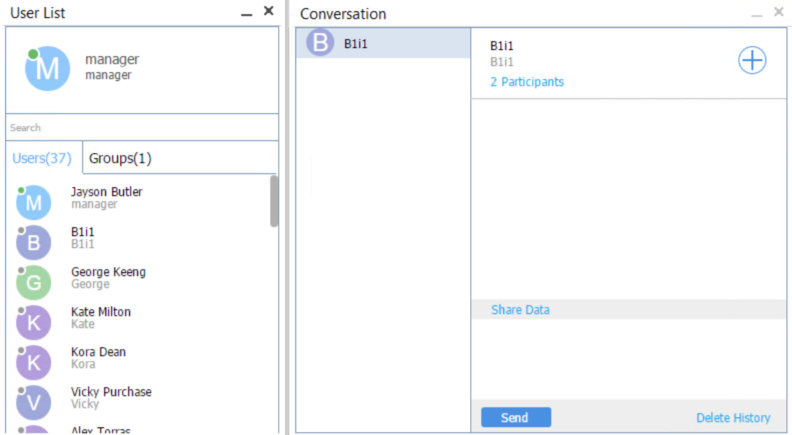Then users can use the icons on the bar menu. The first one is Live Collaboration icon, which will open the window and display all the currently logged-on users. The second one is Send to Conversation icon, which is available when user opens a document and is used to send documents or reports to other users.