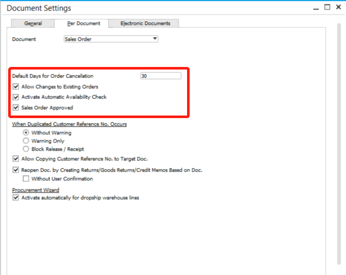 This function does not apply to orders and quotations, where users can set a validity date. In that case, users can go to Administration > System Initialization > Document Settings, click per document tab and define a default validity period. Then the order or quotation will be valid within that period.