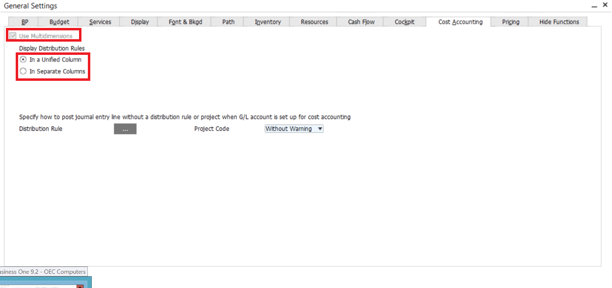 At first, we need to apply multiple dimensions. Choose Administration > System Initialization > General Settings > Cost Accounting and click “Use Multidimensions”. Here we may choose to display all distribution rules in a unified column or separate columns.