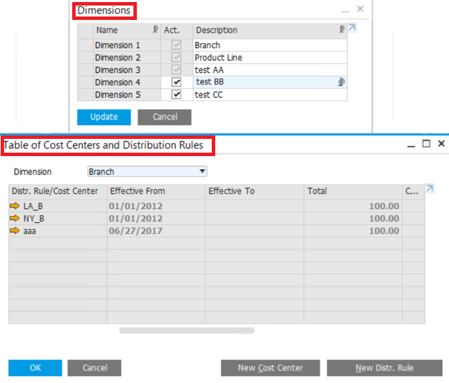 Dimensions configured in the system provide customers with multiple views of an expense and revenue analysis. In SAP Business One, you may distribute the costs from 5 different dimensions and analysis costs more accuracy and comprehensive.