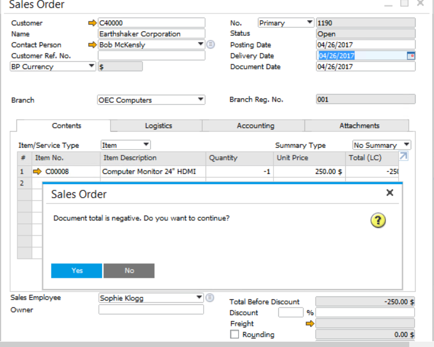 Sometimes users may need a negative payment in a document. Such as when they receive a refund from vendors, or when the customer returns the item for a refund. With many systems this record needs to be entered manually and can be annoying sometimes. SAP Business One, however, offers an option to generate negative payments in the document, which settles the problem more efficiently. This function is available after SAP Business One version 9.1.