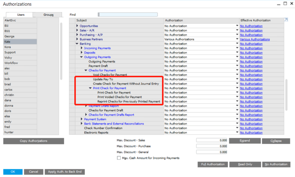 Employees cannot be too careful when they create and print checks. Sometimes they double, even triple check the details. Even then, there may be some mistakes. To help with this situation, SAP Business One has introduced new authorization settings which allow printing checks for payment, avoiding checks, re-printing previously printed checks, creating checks for payment without posting a journal entry, and updating the “Pay To” field after the check.