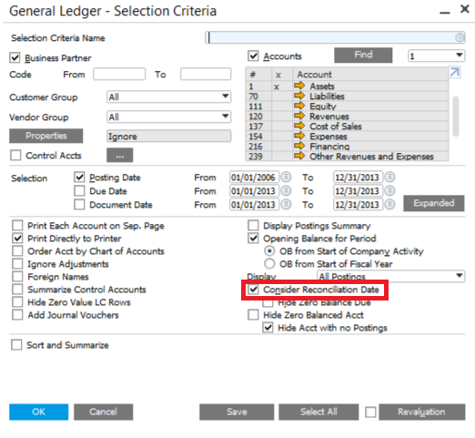 The General Ledger Report is made up of a General Ledger Summary and General Ledger Exceptions and shows a list of the accounts that have transactions by selecting the date range. In SAP Business One, the default setting of the balance due when generating the General Ledger Report is according to the “TO” date you defined. But SAP Business One allow you to consider both the balance due in the defined date and the reconciliation date of the transactions.