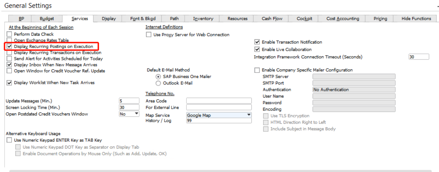 SAP Business One has reminders in case the manager forgets the recurring posting. Go to General Settings > Services tab and choose “Display Recurring Postings on Execution.” Then a reminder window will pop up the next time you log into the system.