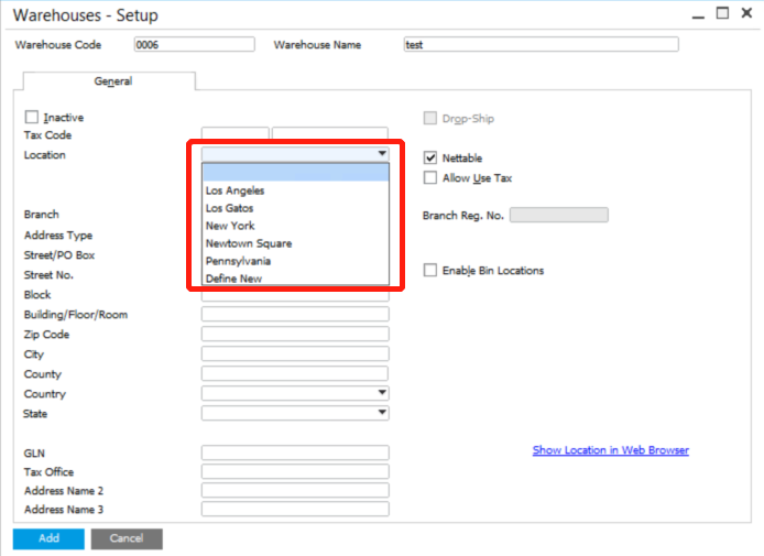 Setup location has many advantages, one of them is that it allows users to connect warehouses with locations and will help improve reports. Once the locations are setup, go to Administration > Setup > Inventory > Warehouse and users can connect locations with warehouses.