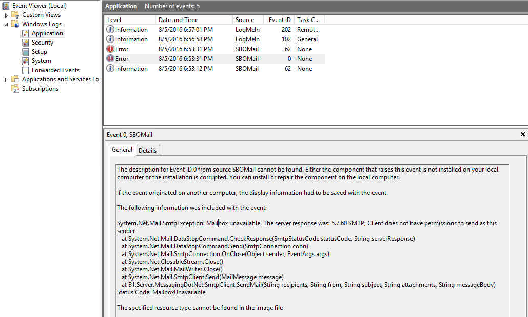 Recently, one of our customer want to use office 365 in SBO mailer service. Exchange will check the SBO user’s email address to see if it match the email address setup in SBO mailer service, if it doesn’t match, the authentication will be failed. (Google work app wont have this issue) and you will see the following error message in application event center.