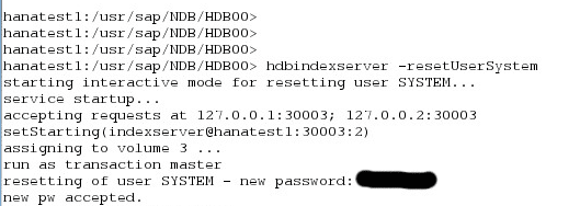 - Now we will start index server to reset SYSTEM password by executing the following commands:hdbindexserver -resetUserSystem