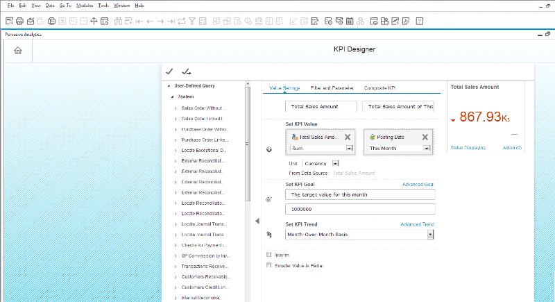 SAP Business One, version for SAP HANA provides you pre-defined KPI widgets and enables you design your own KPI widgets by yourself.