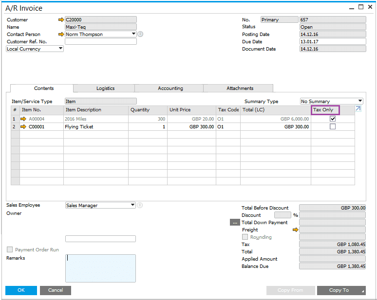 For such cases and similar scenarios that might occur any time during the year, SAP Business One enables you to create a tax-only invoice where you can charge your customer for only the tax related to a certain benefit or item. Just select the checkbox “Tax Only” in the relevant document row.