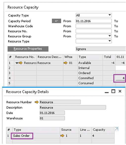 Upon creation of sales or purchasing document for that item, the capacity of the linked resource is updated accordingly: