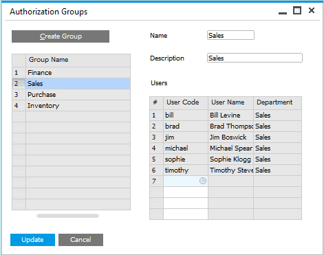 SAP Business One enables you to create authorization groups, and assign to each group the relevant users: