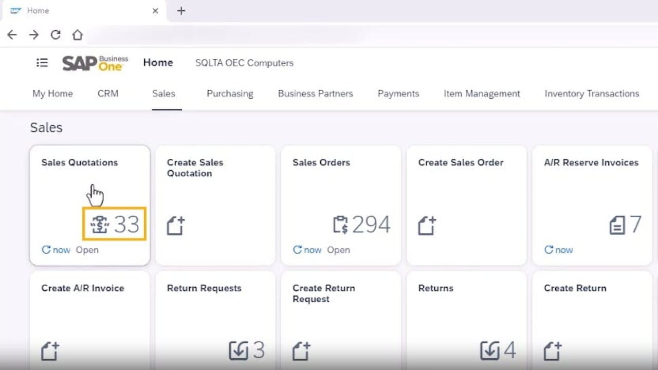 Create, process, and update marketing documents and master data, including approval processes. Deployed in the cloud, on premise, or side by side, SAP Business One, Web client enables activity creation and tracking and provides sophisticated charting capabilities and predefined analytics.